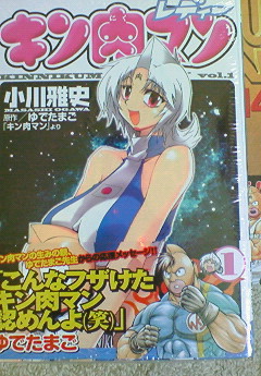 じゃーん これがキン肉マンレディーです← 本屋二件回って手に入れたぁ!!!(ん?そんなに苦労してない??;) は、マジこんなん同人レベルでしょ? と軽く見ていて正直差別的な感情を持っていただけに Σ衝撃を受けました。 あぁ 後10分で熱く語れるかどうかが心配なのですがいってみましょう!!笑 何より一番なのは「テリーがやっぱりキン肉マン大好き過ぎる!」 ・・・いや、これは作者が配慮した結果?原作でもレディーでも相変わらずラブラブな二人ですねえ っていうかキン肉マン(レディー)を見るテリーマン(レディー)の目つきがヤバイ!!/// やっぱりキン肉マンの大和魂に惚れましたってことだったね!原作でもそうに違いないしね! 「お友達から始めましょう///」って何いってんじゃお前は!!っと赤面してそんな初初しい二人にツッコミいれてました;; 更に「キン肉マンはミーの嫁」宣言には驚きました・・・言っちゃったよコイツ、的な。 何かもう他にもラブラブしてんの見れて楽しかったです テリーガール可愛すぎ! 第二に「ロビンが百合百合しい~~!!」 っていうかロビンはエルフの血をひいてんのかΣ そーかそーかだから耳が尖ってんのか! って何でやねん!!!!!(一人ノリツッコミ) ・・・ロビンは由緒正しき正義超人の血縁ですよ。そこんとこヨロシクv でもまぁ・・・こんなロビンも良いかなぁって納得。 クソー!!元々エルフ耳姉属性ぽわぽわ不思議天然系美女が大好きじゃいっ!! あと一々脱ぐのが凄い・・・さすがはチャンプw 第三に「意外とロリ幼女系Σラーメン娘」 これはイイっス!!!!!! 新しい境地開拓しちゃいましたって感じですーーー!!! らーめん にゃん!? 意味が分からない!これから入った人はもう原作読めない!! そして残虐ファイト過ぎる!! これわ・・・酷い・・・屈辱だね。ブロッケンはもう立ち直れないよ・・・ 想像しただけでエロイ。らーめん娘おそるべしッ!!! (何されたかはレディーをお買い求め下さいv) まぁ「最終的には」 ミート君の棚ぼたむちむちってことですかね!!? 表紙からしておっぱいに顔うずくめすぎじゃ!!!王子はぺったんこなのにギャップ有りすぎだろ~ あ でもスグル=キン肉族家代々の筋肉質な身体(男の強さの象徴) に対してキン肉マンレディー=火事場のクソ力むちむちおパイ(女の強さの象徴) ってことで合っているのかも・・・いや、自分でも良く分からないです。 取り敢えず面白く読めました!テリーガール可愛すぎ!(二回ゆうことは大事) ぜんぜん伝わってないとおもいますが、こんな感じです。 二巻期待して待ってます。 でわ ご静覧ありがとうございました ヘイ!おまけ 押すと「火事場のクソ力ー!!」って叫ぶよv 意外に格好いい仕様で満足。200¥高いけどね ロビン欲しかったってのは内緒ですw
