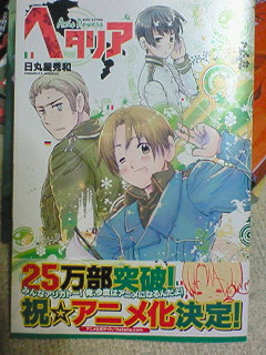 09/17/22:38 いろいろ購入。「夜刀神の 中古ですが;; 話とか分かりません。漫画の存在自体本日初めて知りましたしね; ・・・ん? でも作画は志水アキさんじゃないスか! 幻水Ⅲ以来じゃないですか! どうりでちょっと見たことあると思いました。 エロイけど、話理解不能だけど(私が馬鹿で。苦笑) ・・・絵凄い綺麗。 もっと真剣に読みたい。 後これぇぇぇ!!!!! 買った!通販で!昨日16に届いたぁ~ みんなから現地調達出来るのに・・・。 って言われたけど全然関係ない!! ウェー 日本可愛いよ~ でも一番好きなのは ロマーノv イタリア=ロマーノが好き!! イタリアと同じ顔でツンで口悪いのがすごいキテる/// ●内容は結構ネットで公開されてるの多い感じがしたけど ところどころいい感じに書き下ろしがあって良かったです。 個人的にアメリカとイギリスの倉庫なんとか(すみませ・・・っ!) が収録されていて嬉しかった!(好きなんですよアレ!!) ポーランドが出演少なかったかな? 2巻も買いますよ!!ヴェー